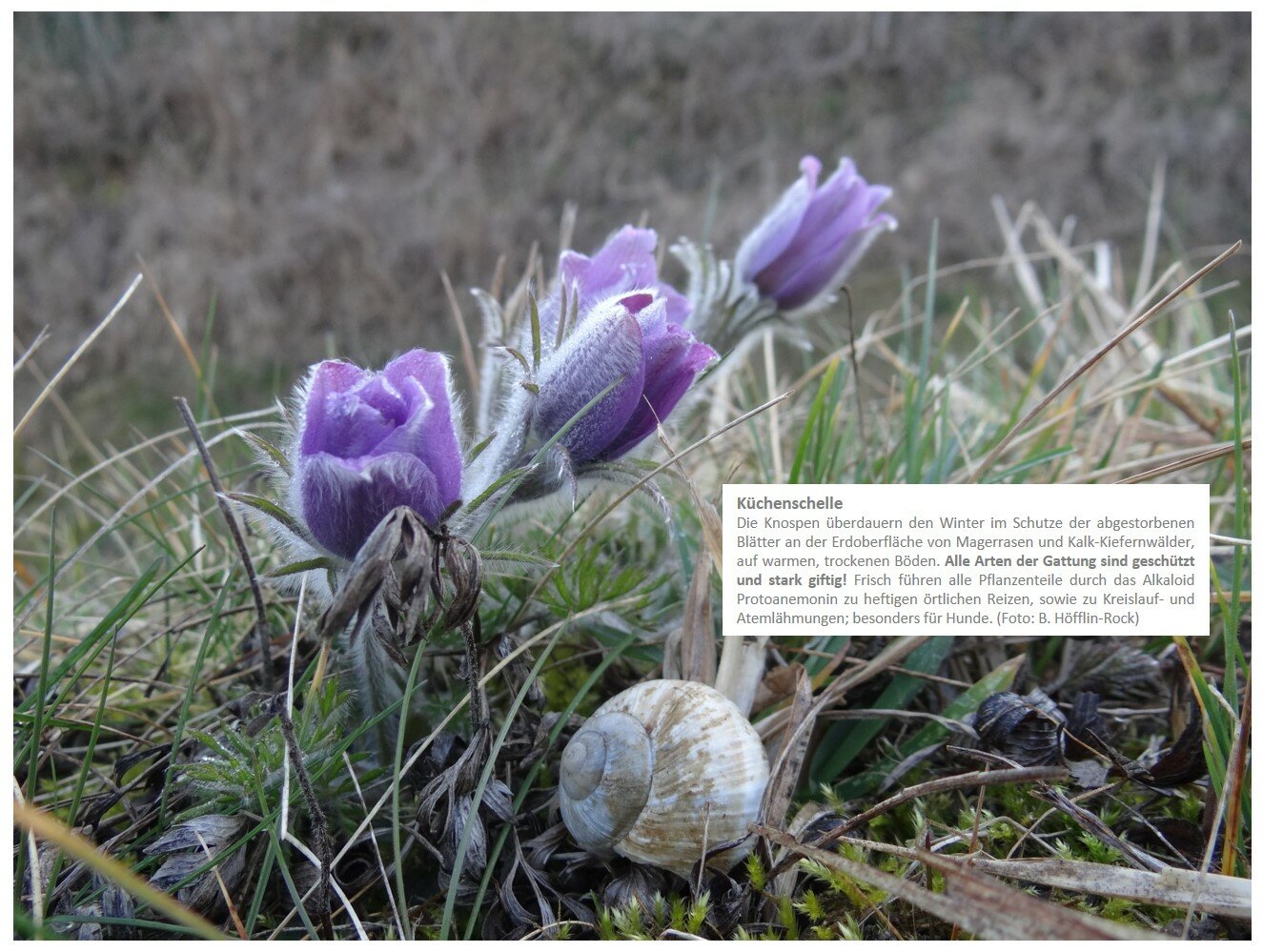| Küchenschellen | März | Badberg bei Alt-Vogtsburg und weitere Trockenrasen rund um Schelingen, kleine Magerwiesen und Rebböschungen z.B. bei Ihringen |